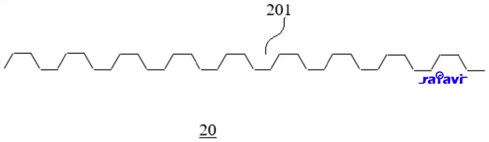 | 进一步地,如图4所示,散热件20沿第二方向延伸,散热件20上形成有多个安装槽201,相邻两个安装槽201的开口方向相反,每个电池10位于对应的安装槽201内。每个安装槽201的形状与电池10的壳体1的形状相适配,以使壳体1的侧壁与安装槽 201的侧壁贴合,从而可以使电池10上的热量能够快速传递至散热件20上进行散热,以降低电池10的温度,保证电池10的正常工作。 |