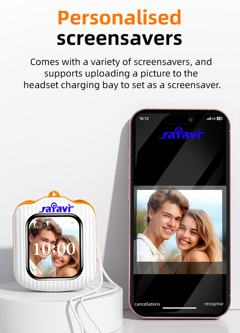7. Personalised screensavers:Comes with a variety of screensavers, Support for mobile phone local photo album images.and supports uploading a picture to the headset charging bay to set as a screensaver.